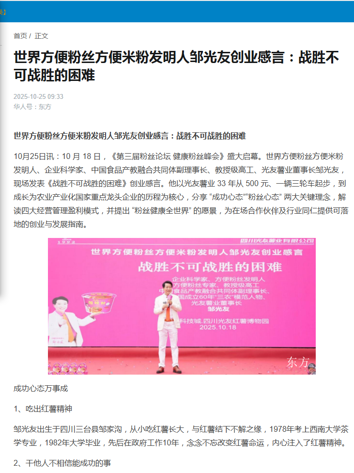 轉(zhuǎn)載華人頭條-世界方便粉絲方便米粉發(fā)明人鄒光友創(chuàng)業(yè)感言:戰(zhàn)勝不可戰(zhàn)勝的困難